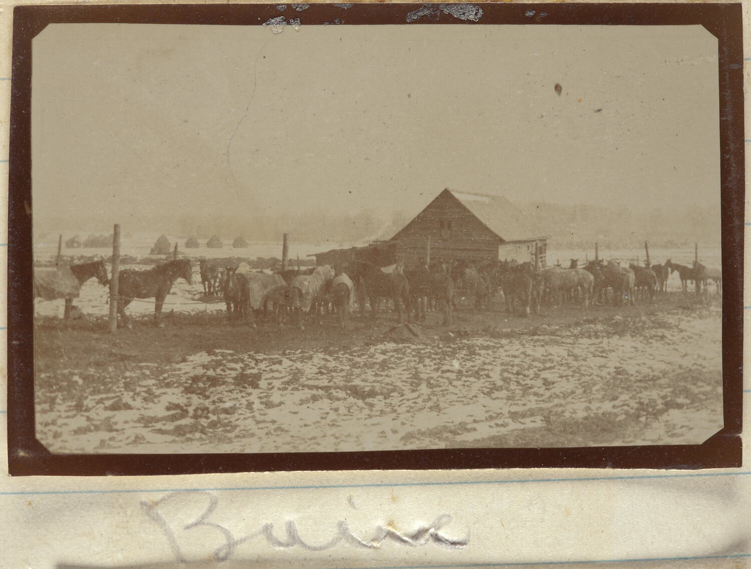 Photograph of tied down horses in a field. In the foreground there is a snow covered field. In the middle portion of the photograph there is a number of tied down horses with a wooden structure immidiatly behind them. In the background there is a field with several structures that looks like hay stacks and a forest or tree line in the far background.