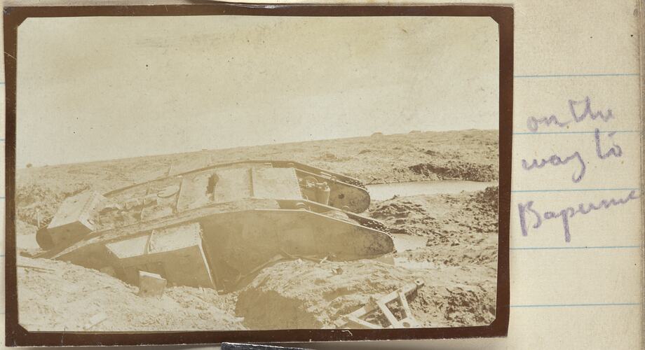 Photographs in the album depict army camps, hospitals, trenches, early tanks, landscapes, cemeteries and graves and groups of posed Australian soldiers. The places Lord mentions in his captions are La Boiselle, Quarry Siding, Pozieres, Albert, Bapaume and Favreuil.