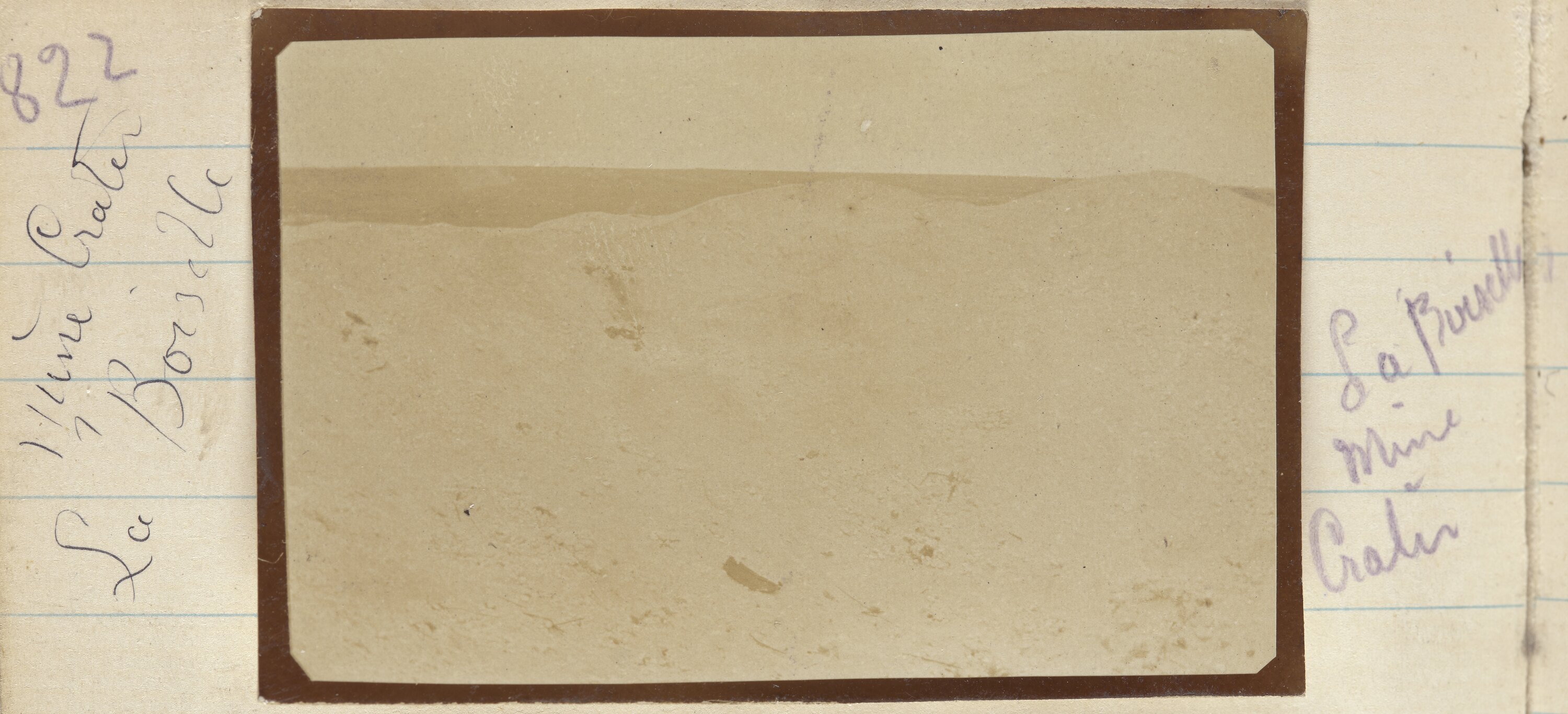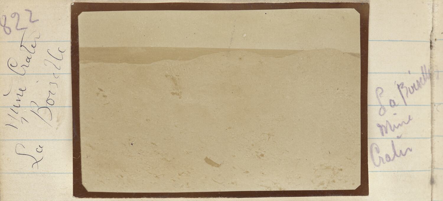 Hand written on the secondary support on the left hand side of the image: '822' 'Mine Crater / La Boiselle' Hand written on the secondary support on the right hand side of the image: 'La Boiselle / Mine / Crater'