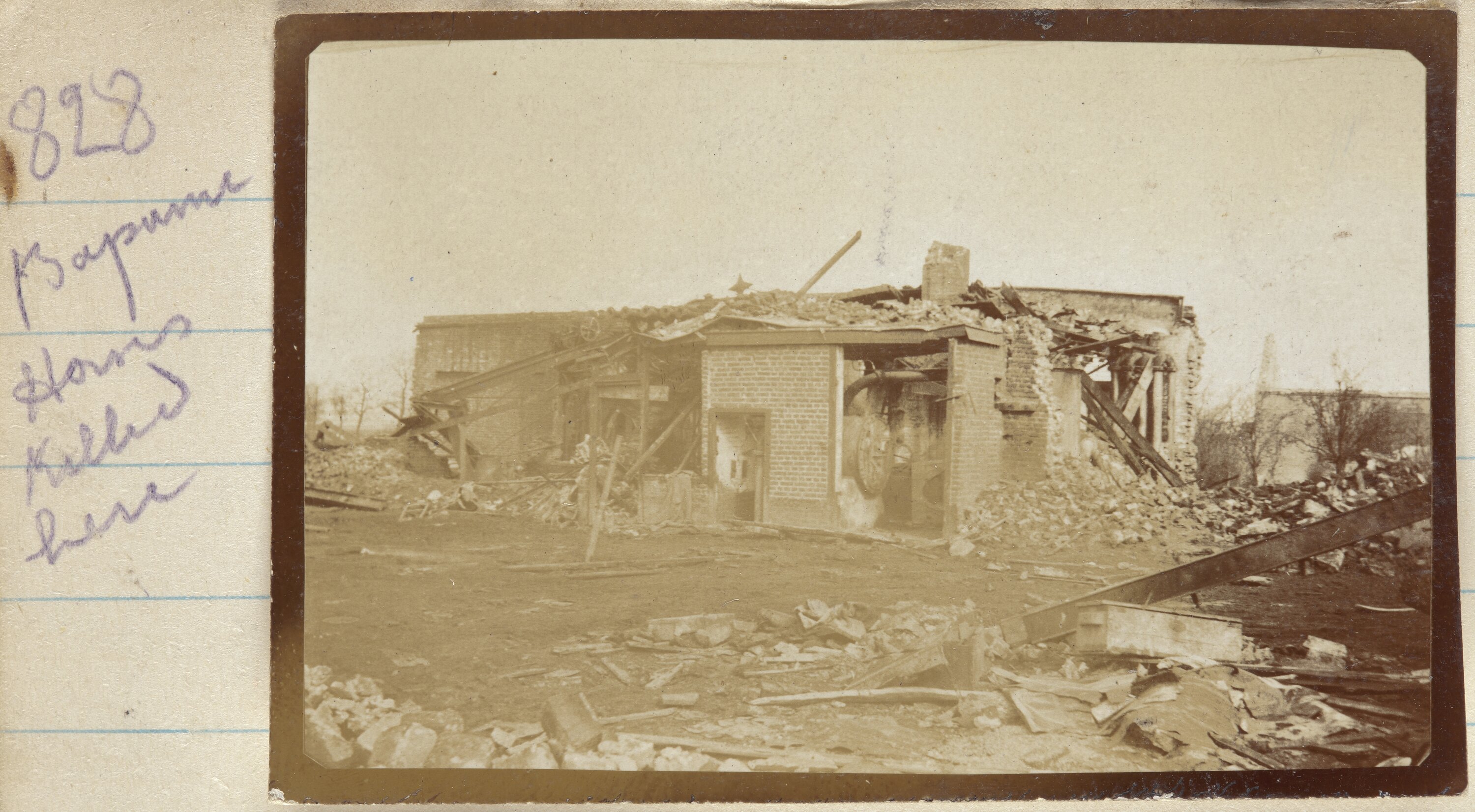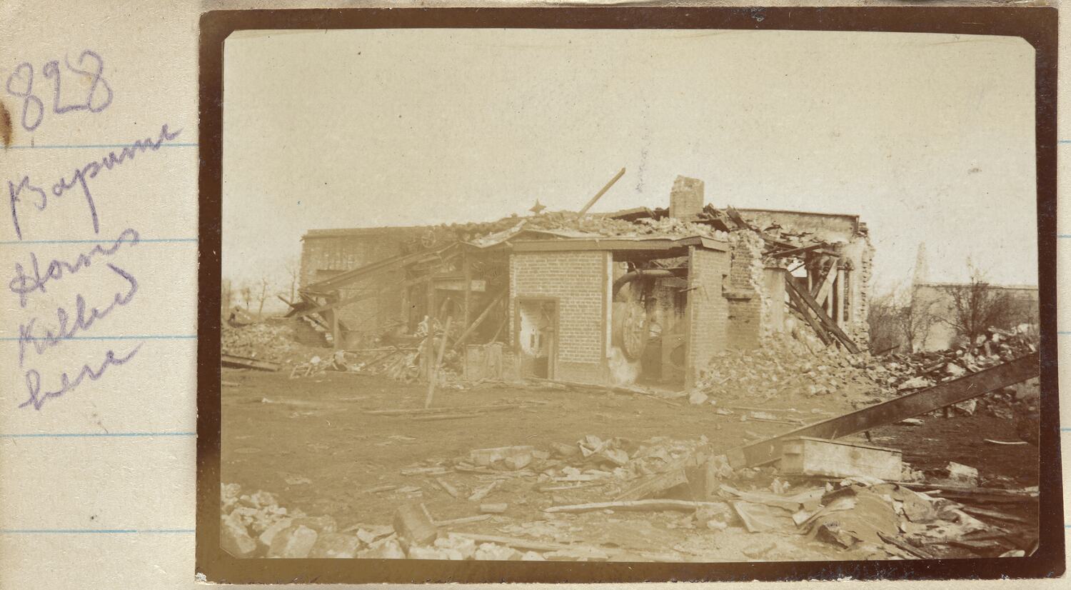 Hand written on the secondary support on the left hand side of the image: '828' 'Bapaume / Horses / Killed / here'