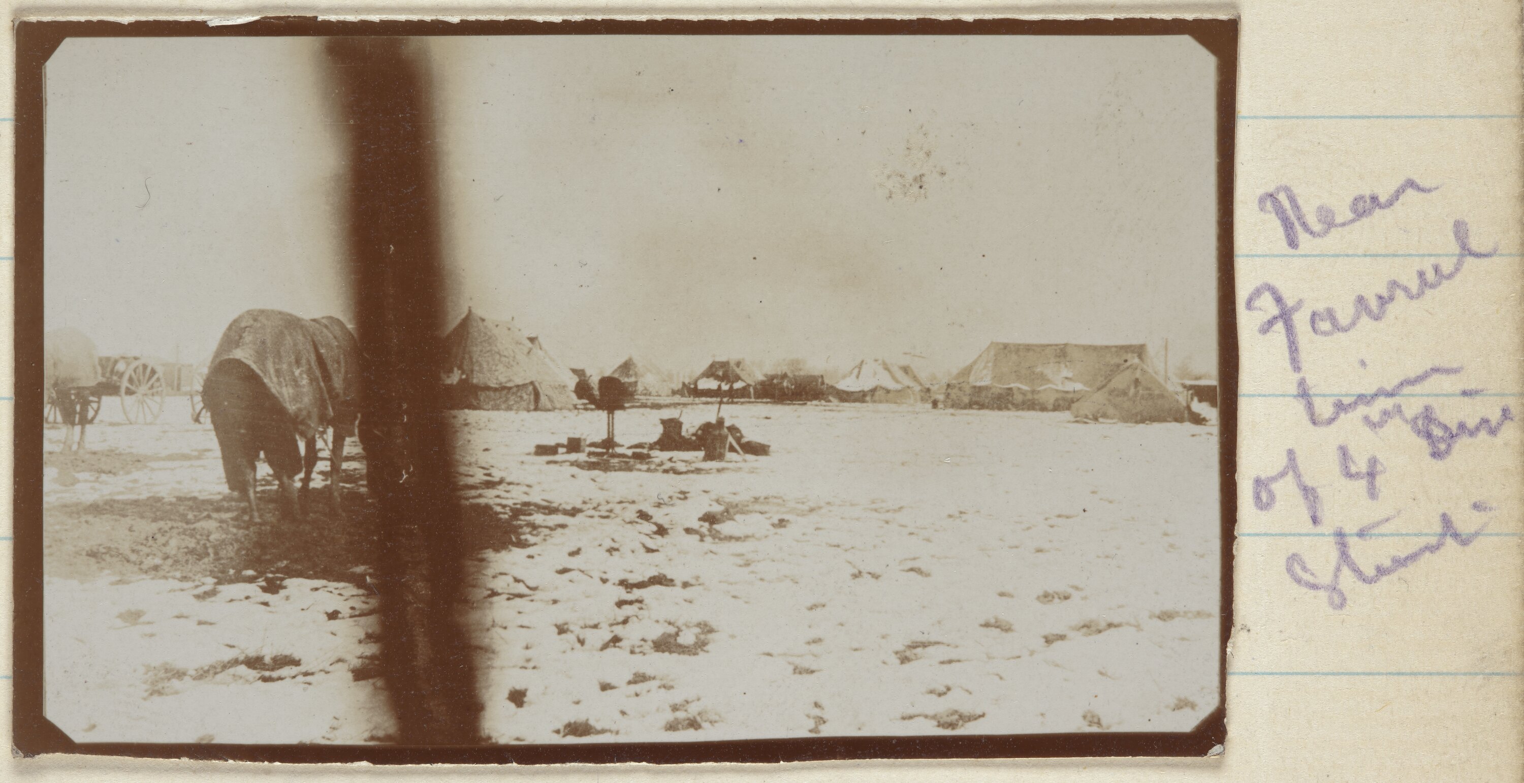 Snow covered centre of army camp with horse and debris in the centre of the picture. Several tents in the background. In the extreme foreground and out of focus there is a rope.