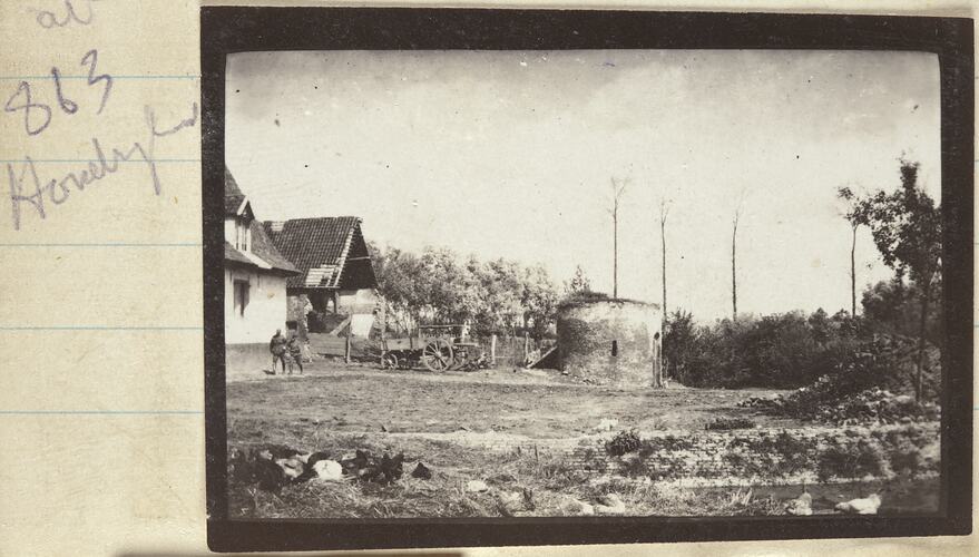 Om the foreground of the photograph there is a pond with a brickwall. Immidiatly behind the pond there is an old block house (round brick building) with a line of trees to the left and a open wooden building, a horse cart and a chalked building barely visible on the left edge. Two persons are walking in front of the chalked building.