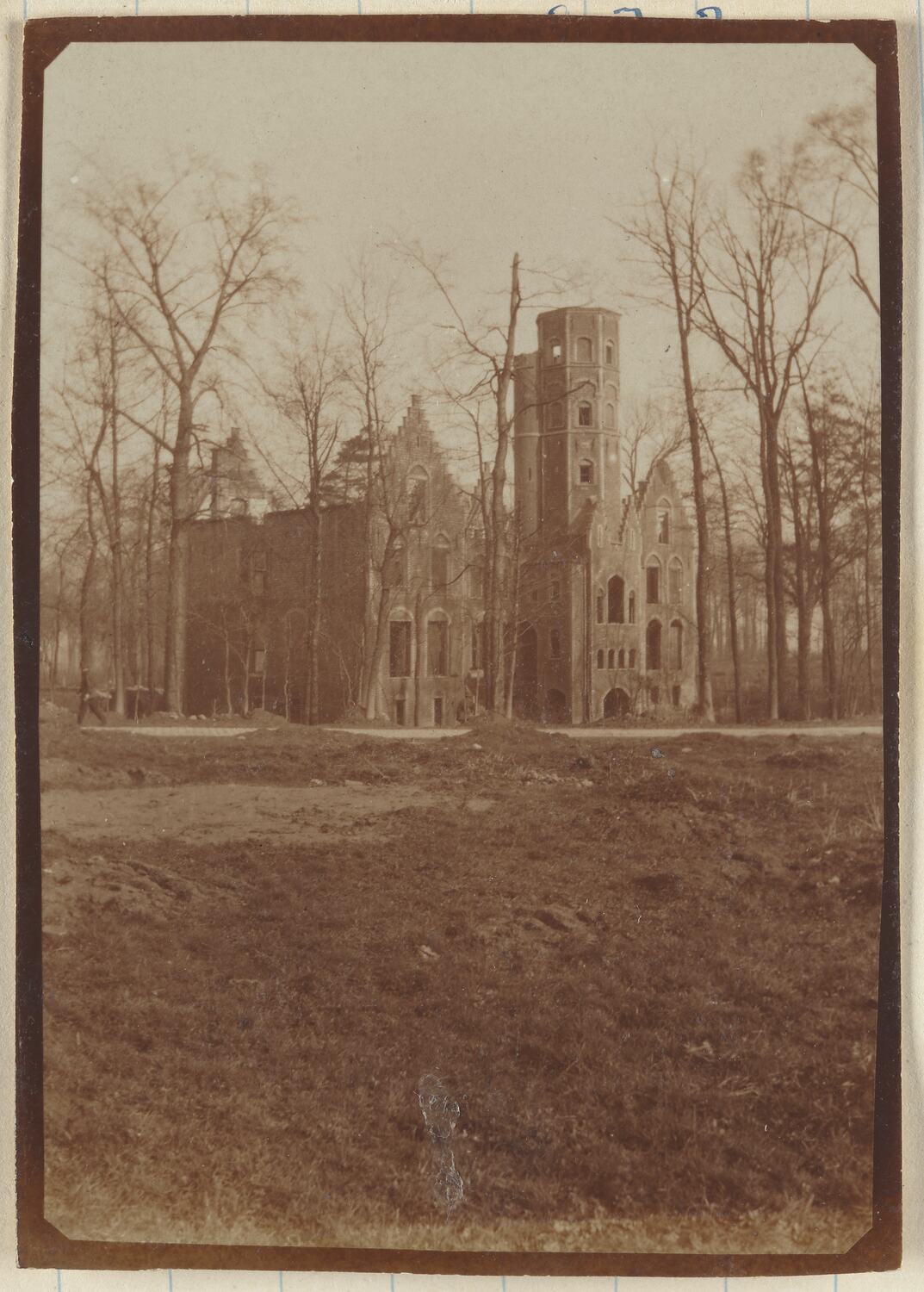 The central object of the photograph is a mansion or chateau. In the foreground there is a field and a cobblestoned road. In front of the mansion there are several trees.The mansion it self is missing most of its roof and windows.