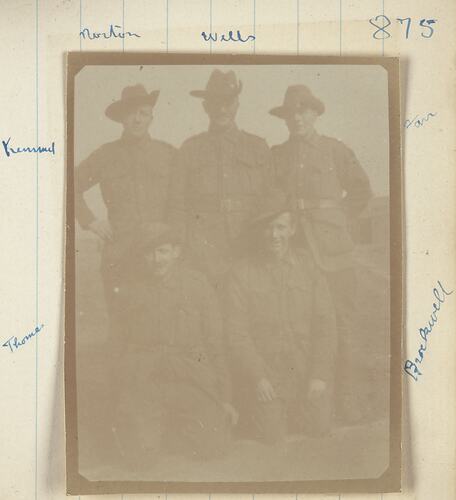 Photograph of a group of soldiers wearing uniforms and slouch hats. There are two rows of soldiers with the two soldiers in the front row kneeling and the three soldiers in the back row standing. A wooden building is barely visible on the right side, behind the soldiers.