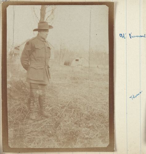 Photograph of soldier (Lance Corporal) wearing a slouch hat standing in a field. In the background there is a wooden building on the left and a Nissen hut on the right.
