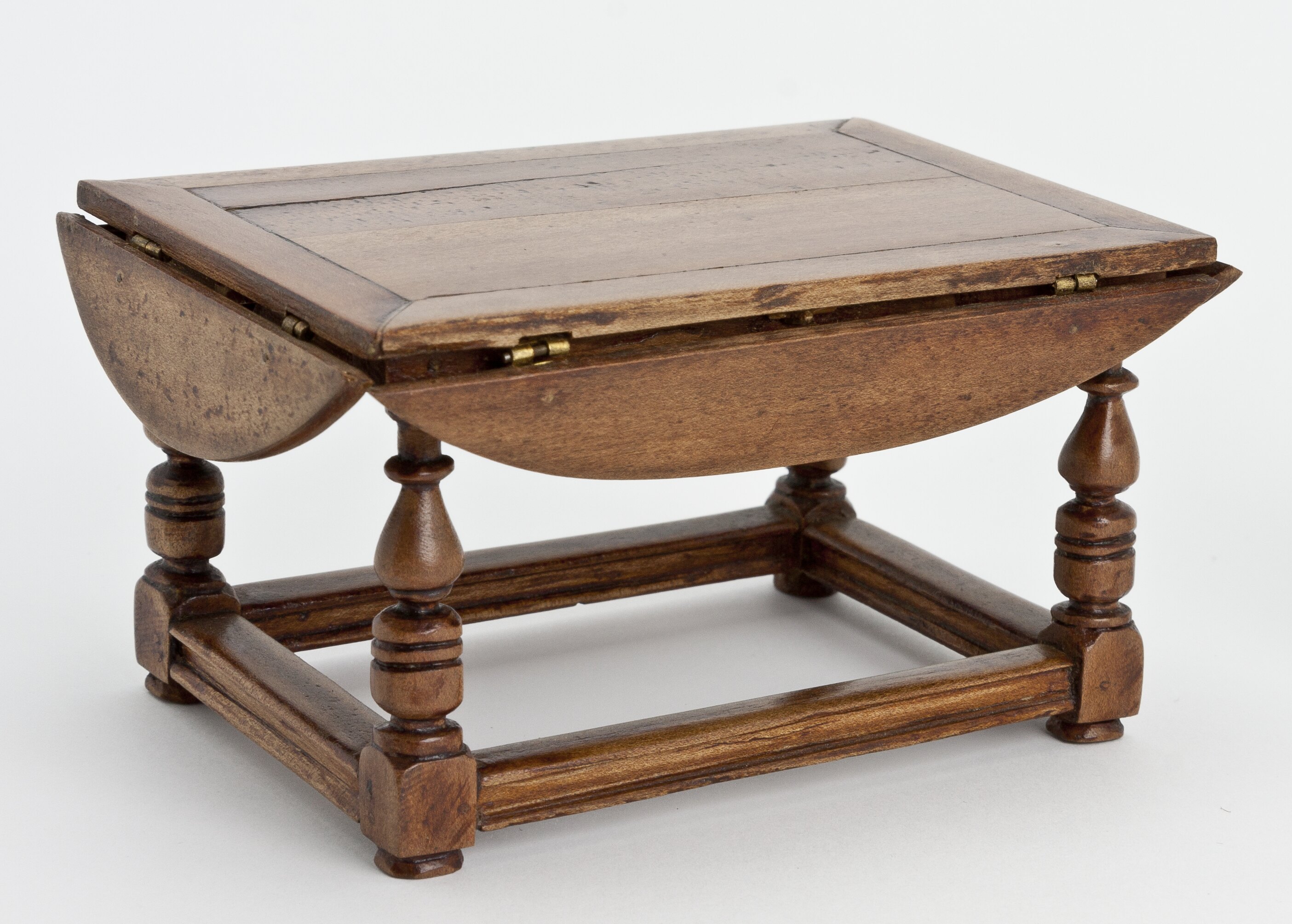 Wooden table with turned legs. Table top has four drop down sides.
