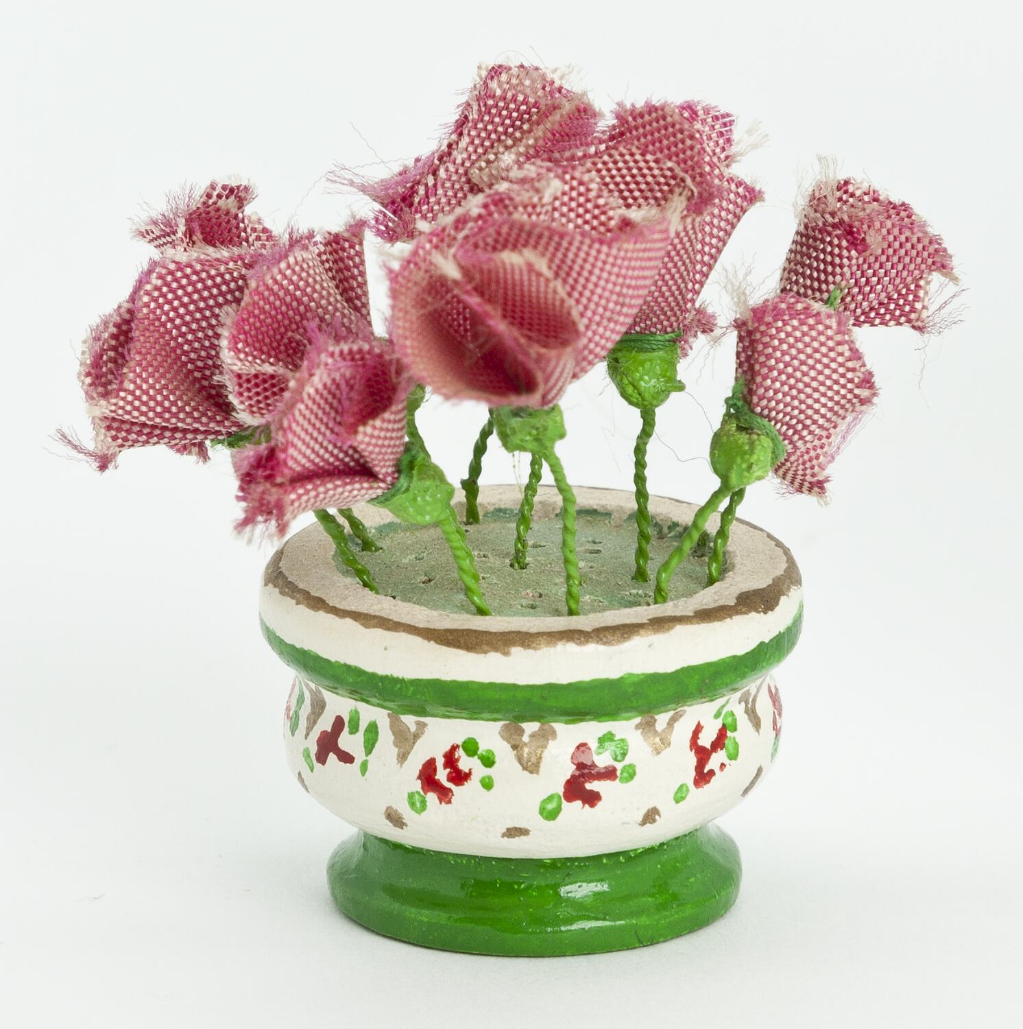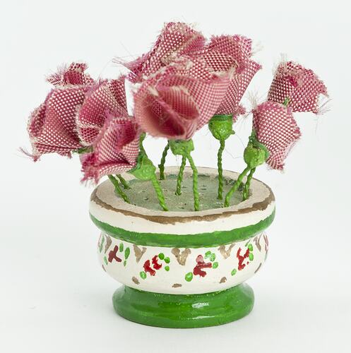 Small green and white pot of pink fabric flowers.