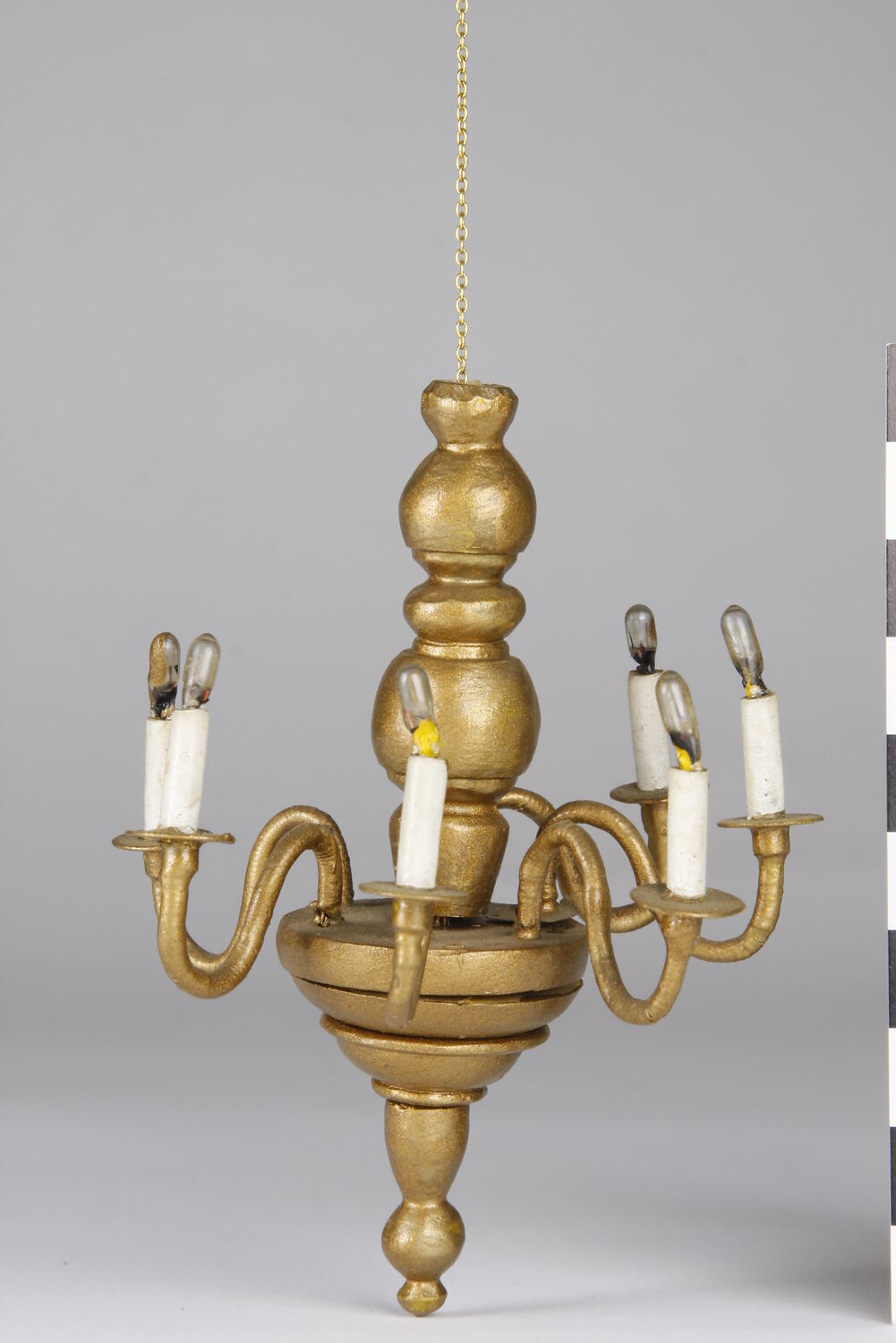 Gold painted wooden six arm chandelier. Fine gold chain attached for hanging chandelier.