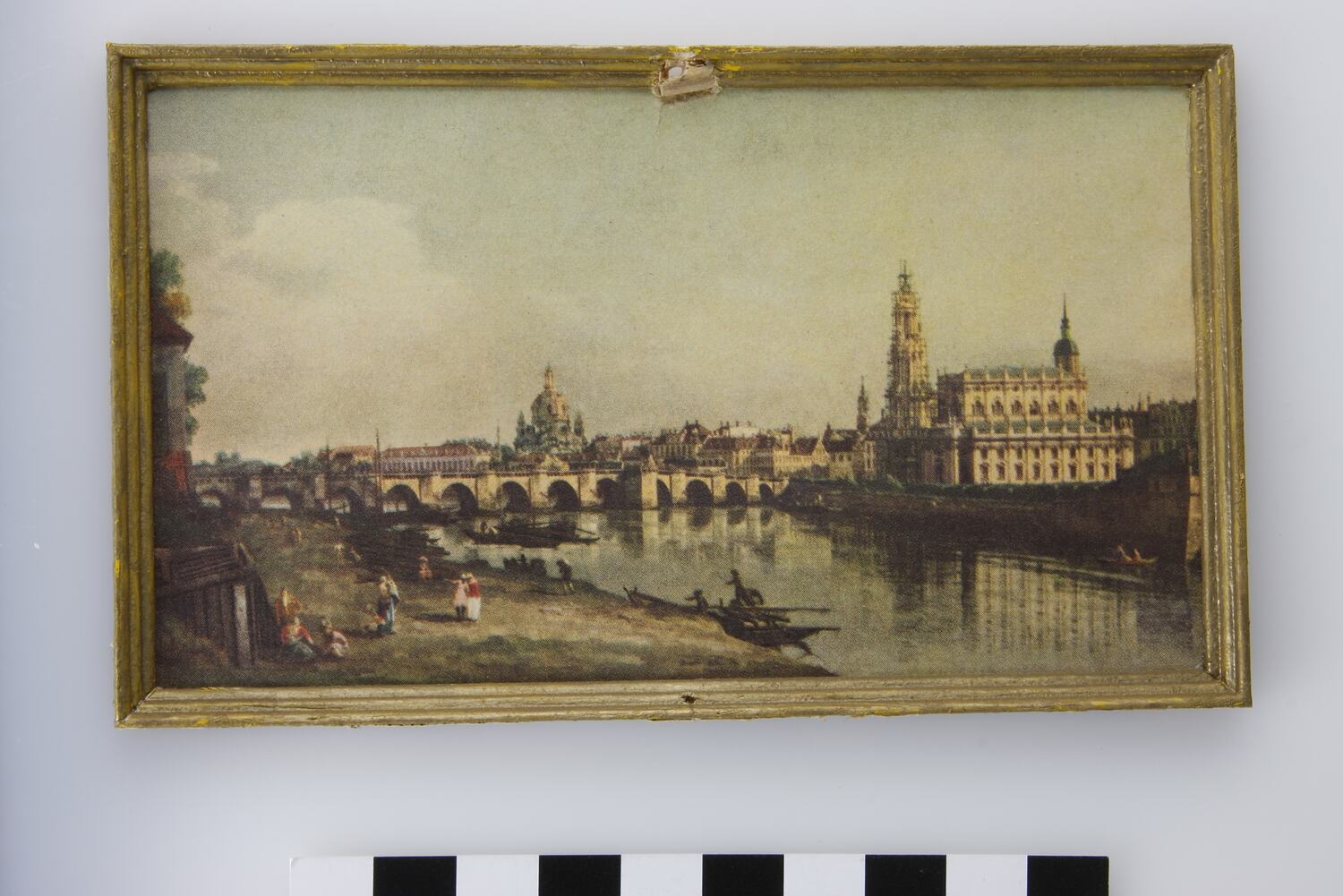 Colour image made to resemble a painting in a gold painted frame. Painting is a landscape of some people near the bank of a river. In the background is a large building and a bridge.