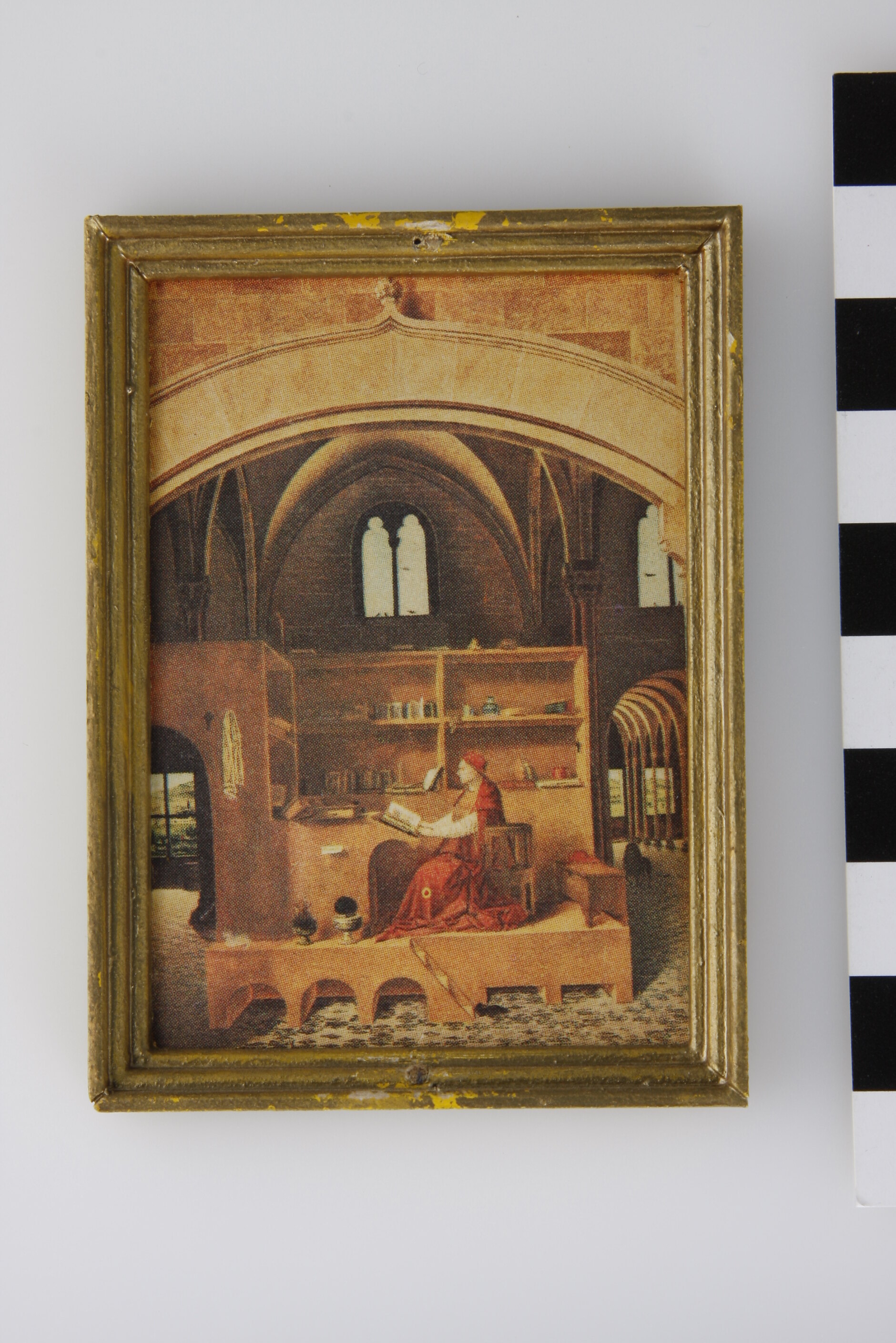 Colour image made to resemble a painting in a gold painted frame. Painting is of a man wearing red robes siting on a chair in a room reading a book.