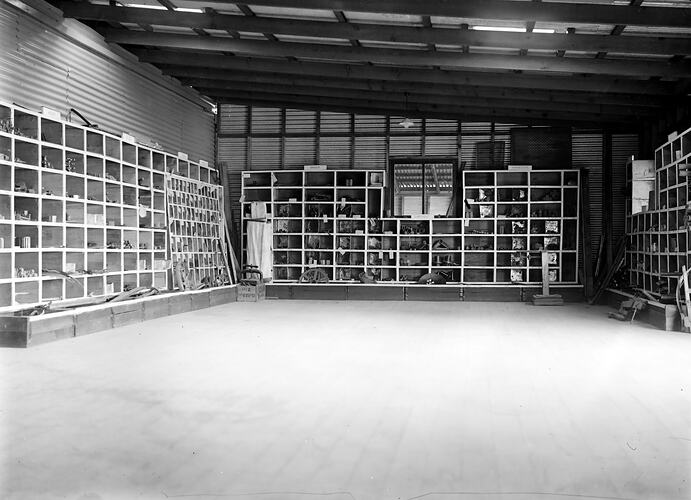 An interior view of W. J. Thompson 's store, H.V. McKay agent at Bordertown, showing the shelving and storage facilities.