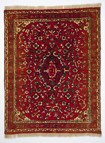 Rectangular piece of carpet. Cream fringe at each end. Red background with green and cream flowers.