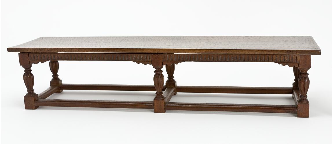 Rectangular wooden table. Six turned legs with a rail running between the legs.