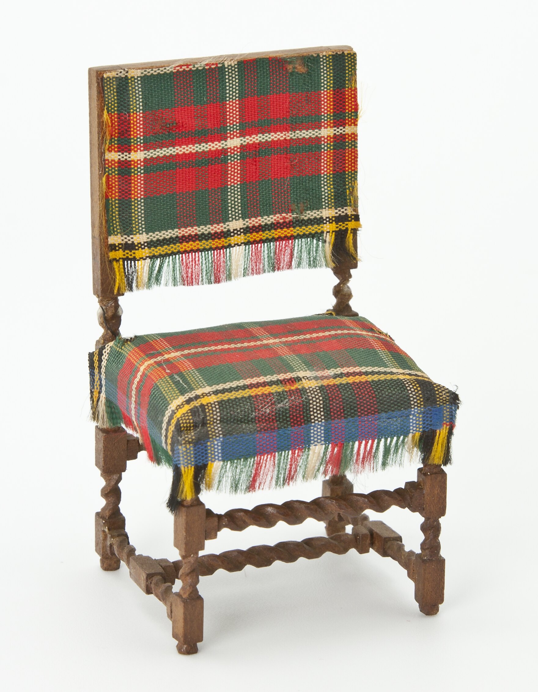 Chair with tartan upholstered seat and back. Chair has turned legs.