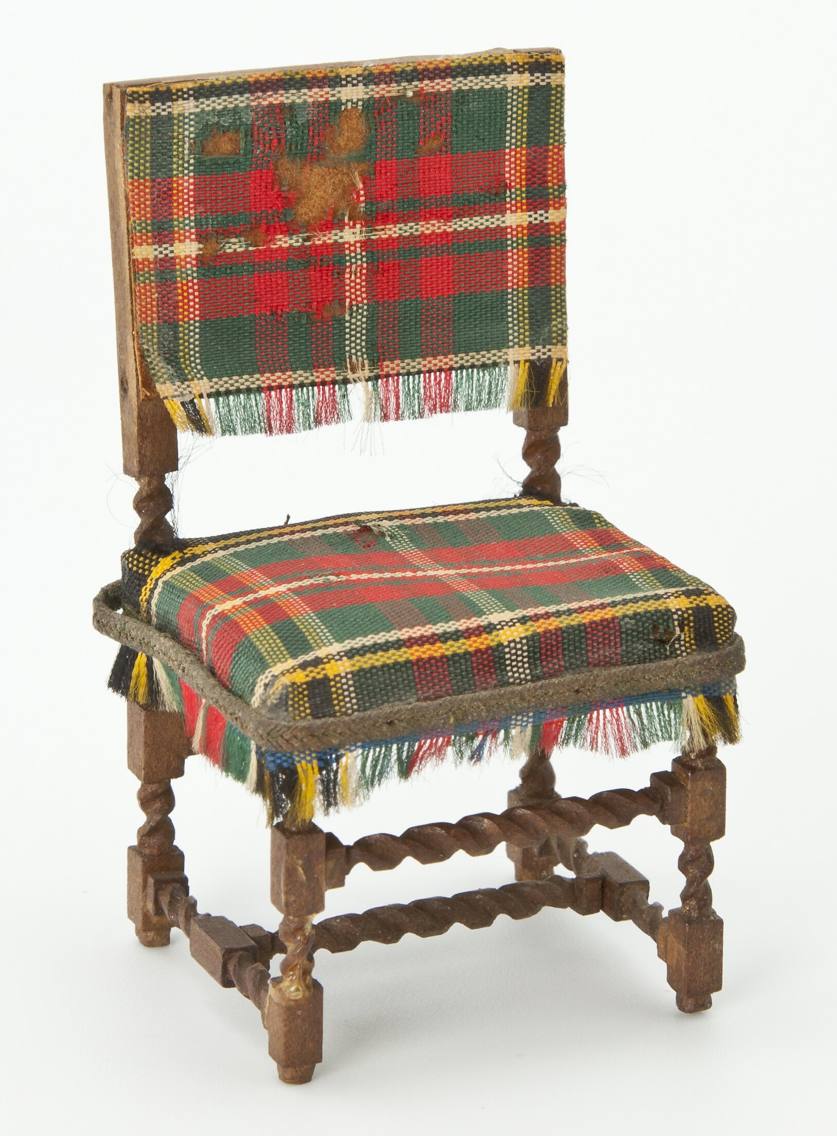 Chair with tartan upholstered seat and back. Chair has turned legs.