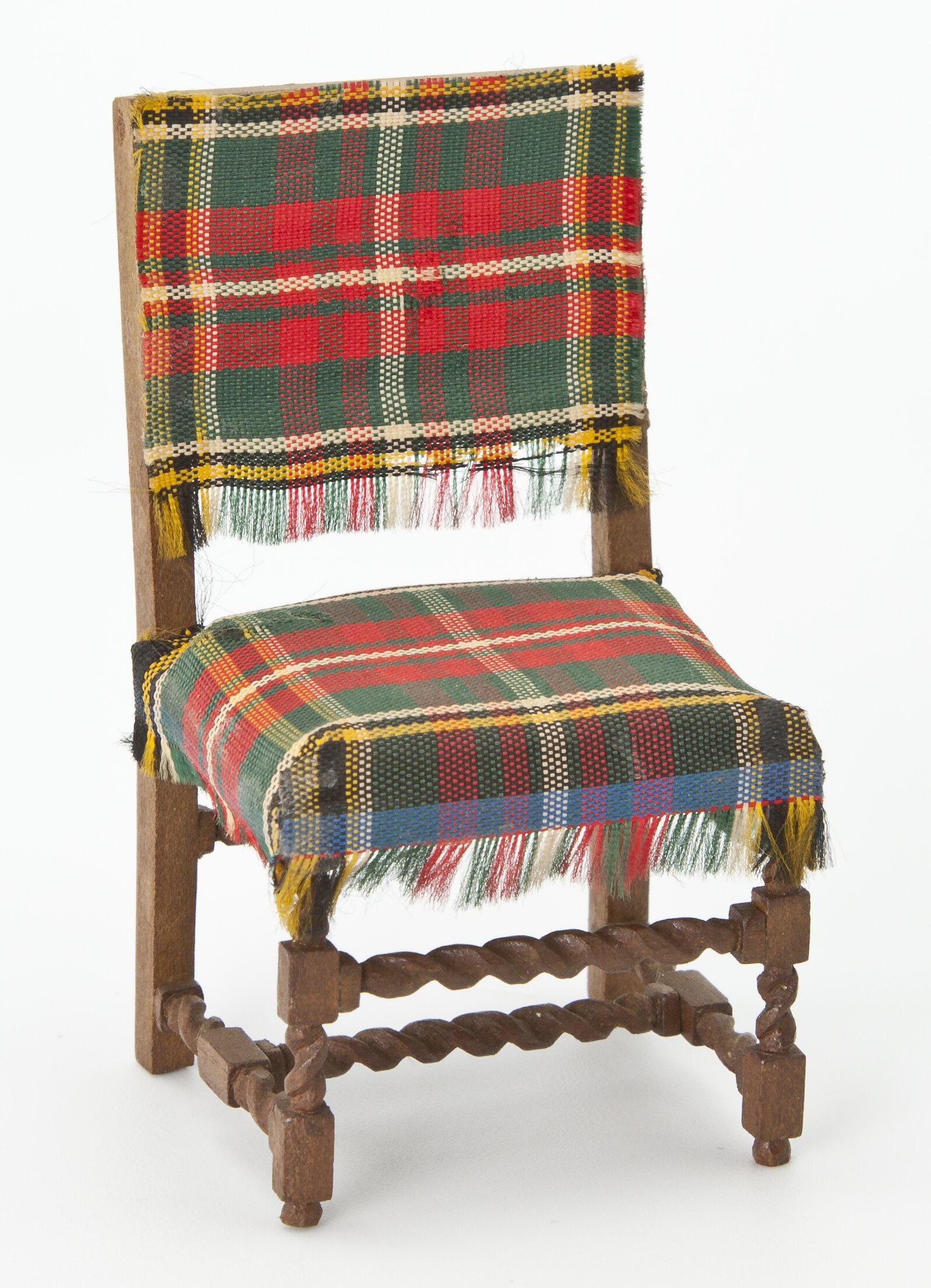 Chair with tartan upholstered seat and back. Chair has turned legs.
