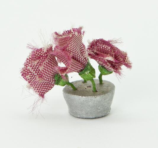 Silver painted vase of four pink fabric flowers.