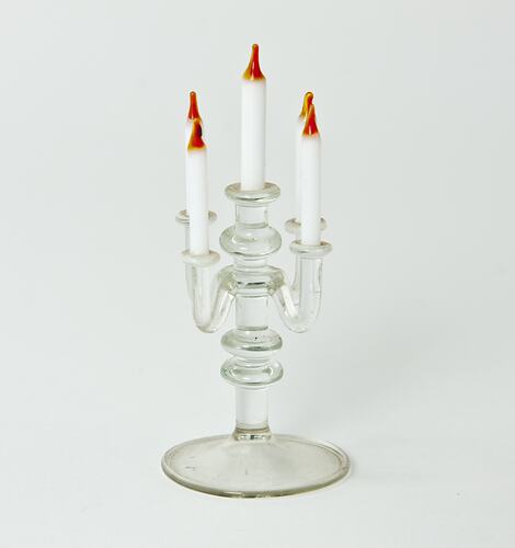 Clear glass candelabra holding five white candles with red wicks.