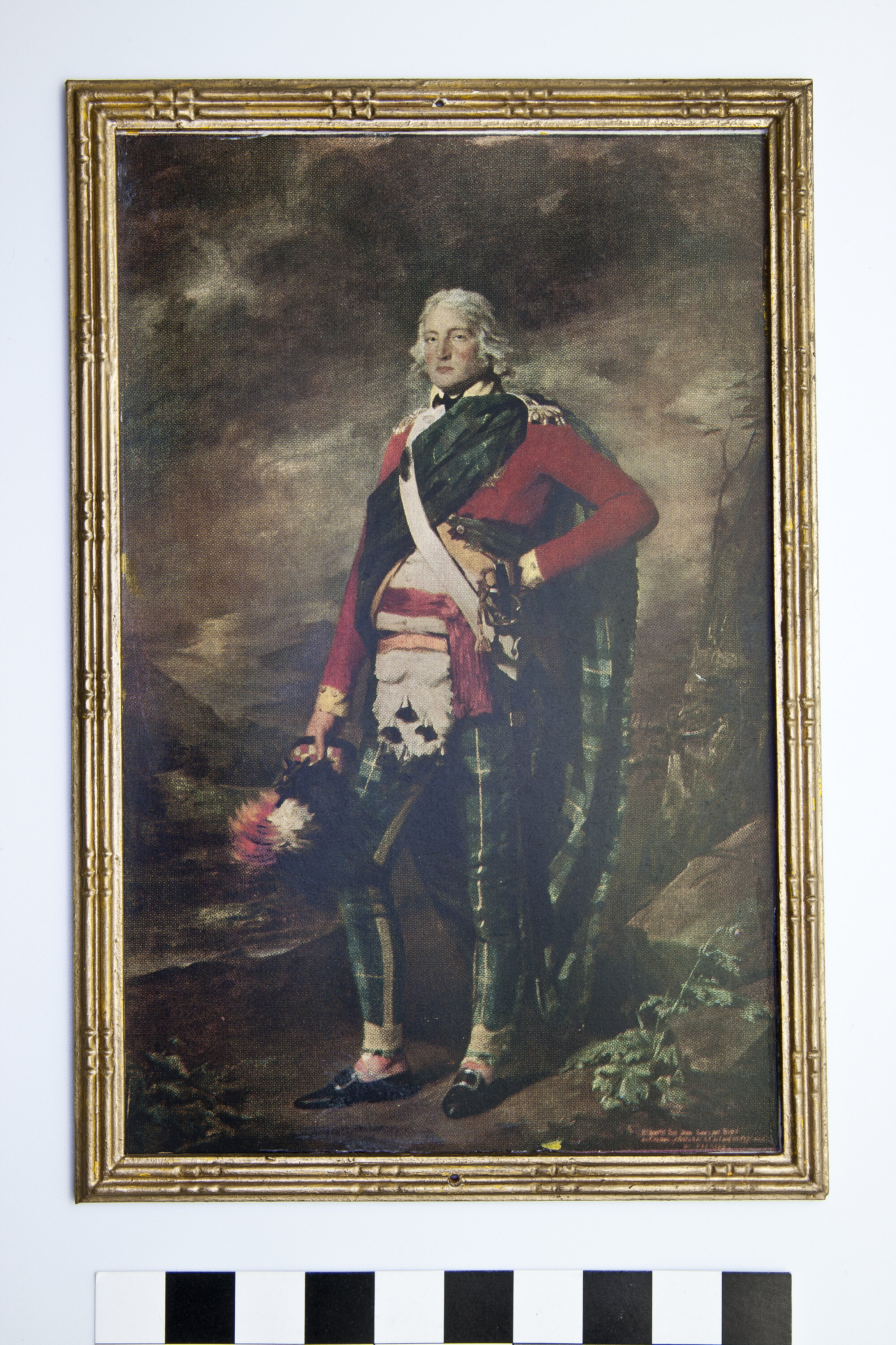 Colour postcard made to resemble a painting in a gold frame. Image is of a man wearing a red jacket and green tartan trousers.
