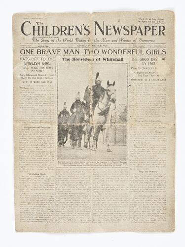 Text, printed: The/CHILDREN'S NEWSPAPER/The Story of the World Today for the Men and Women of Tomorrow/ONE BRAVE MAN-TWO WONDERFUL GIRLS.