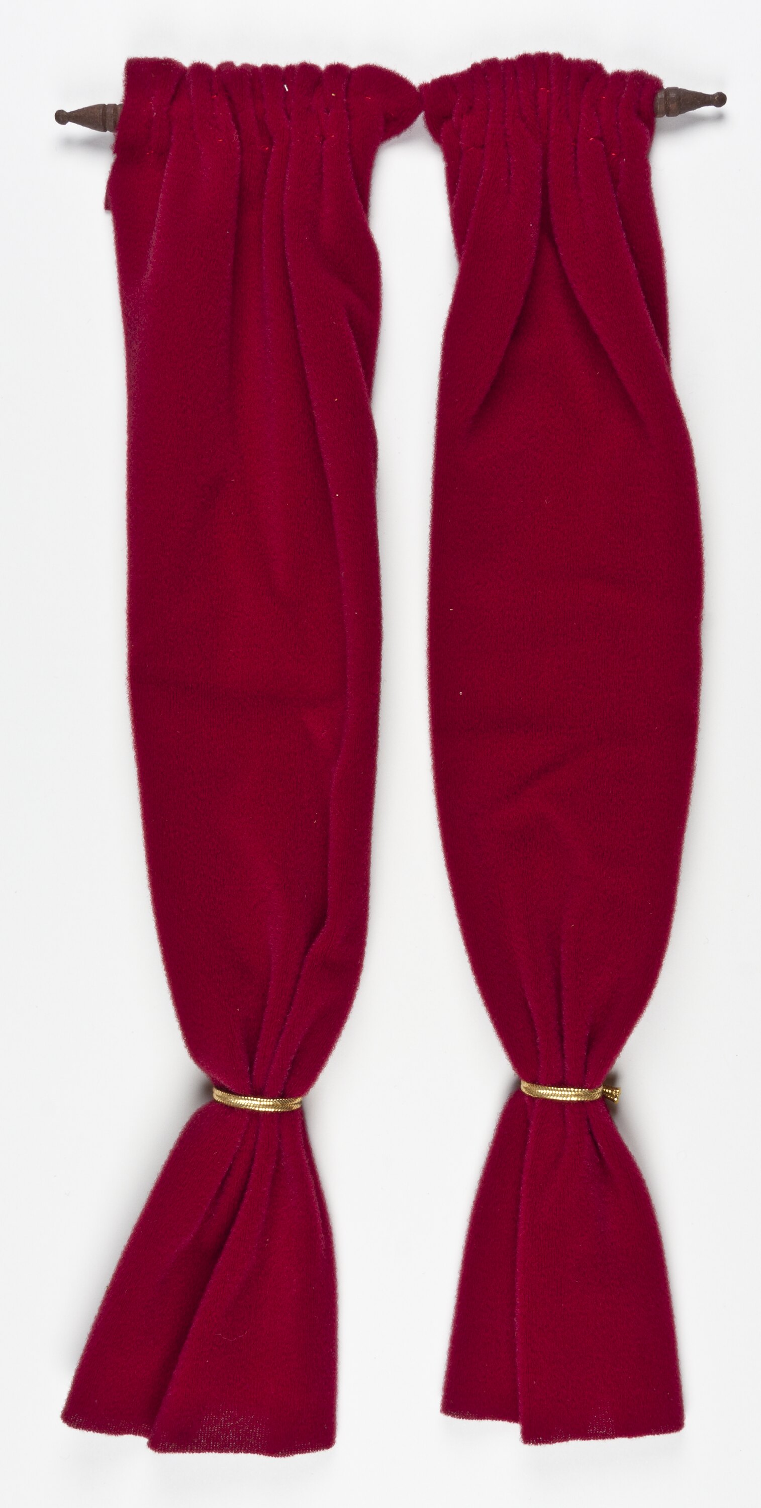 Pair of crimson curtains on a wooden curtain rod. Tied with a gold band.