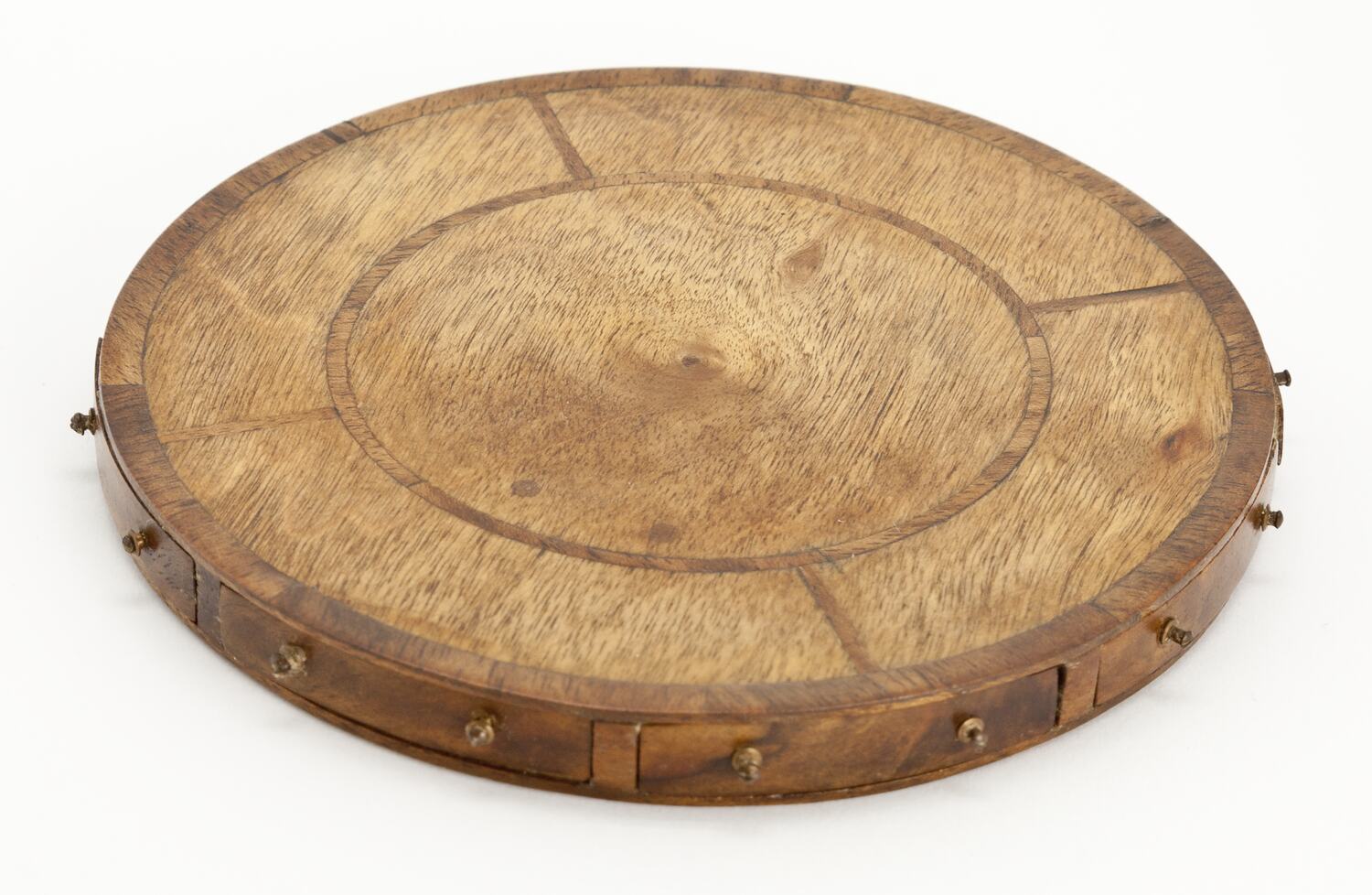 Round wooden table with eight small drawers around edge.