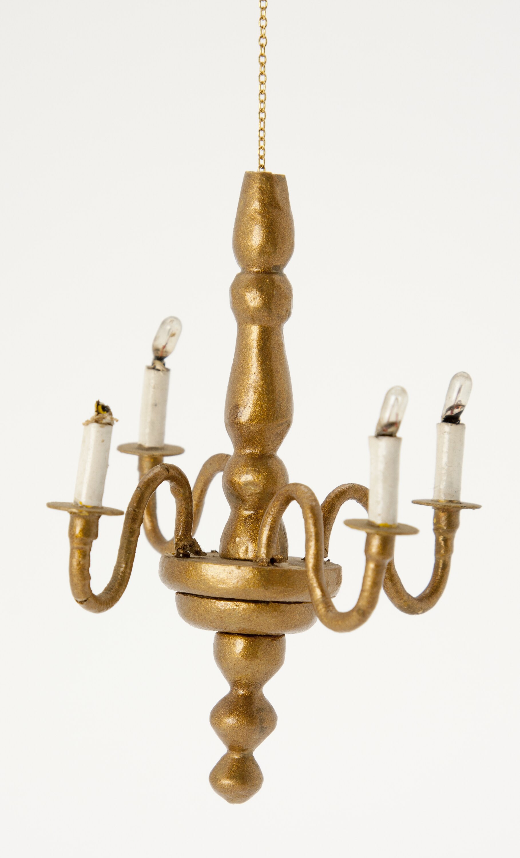 Gold painted wooden four arm chandelier. Fine gold suspension chain at top.