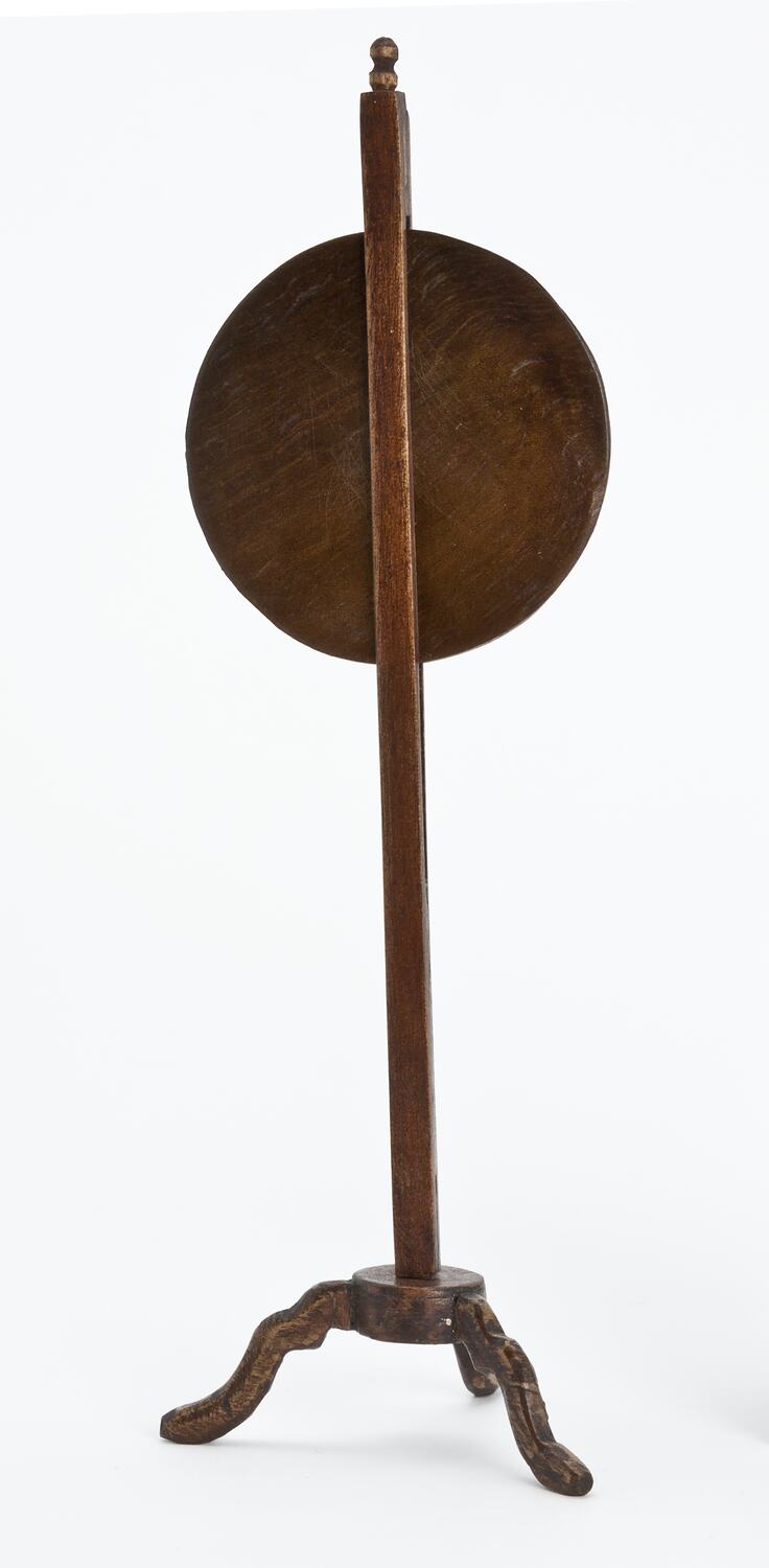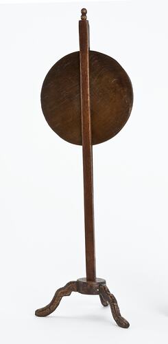 Wooden fire screen for protecting the face near open fires. Round wooden disc on a stand with three carved lags at base.