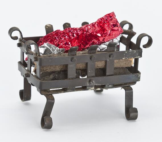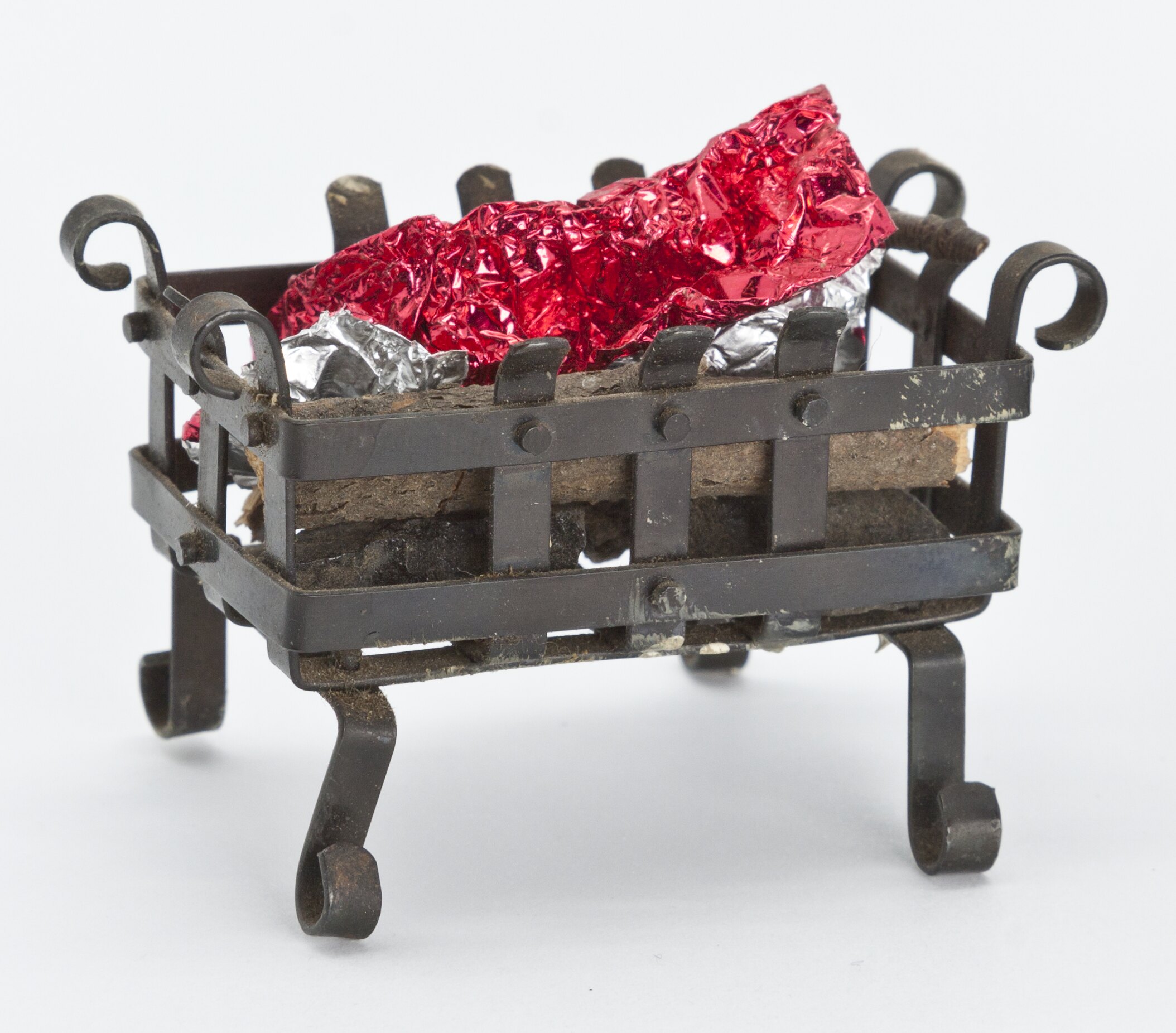 Rectangular metal fire grate. Grate contains logs and bits of coal. Red silver foil to resemble flames.
