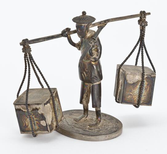 Metal ornament. Chinese man carrying a pole over his right shoulder with a square box hanging from each end.