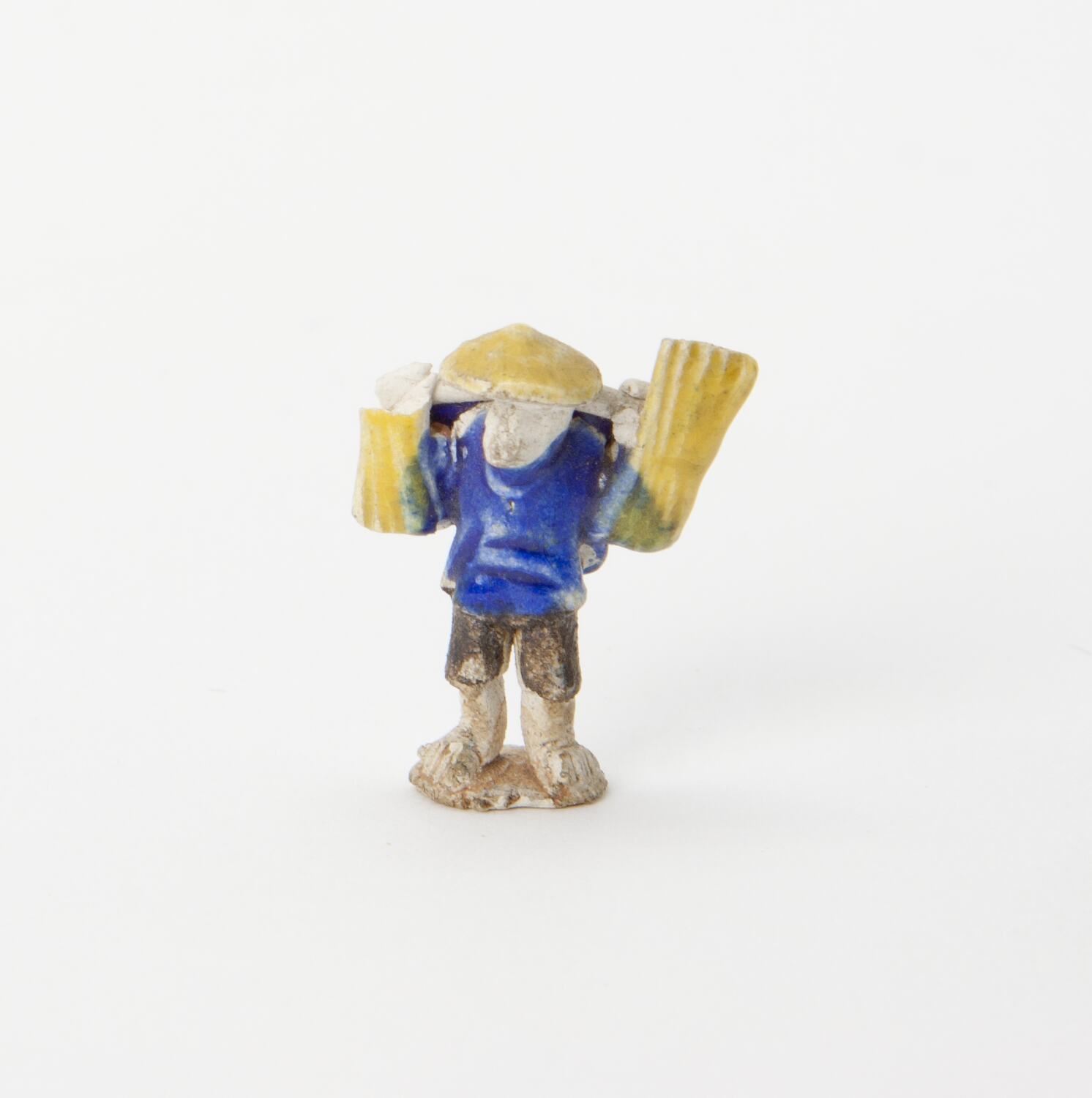 Small ceramic ornament. Chinese man wearing a blue jacket and yellow hat.