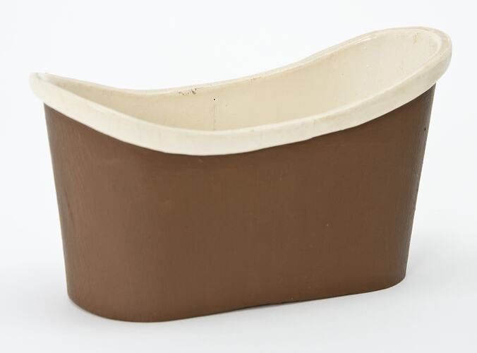 Brown and cream painted wooden bath tub. Higher at one end than the other. Bath is brown on the outside and cream on the inside.