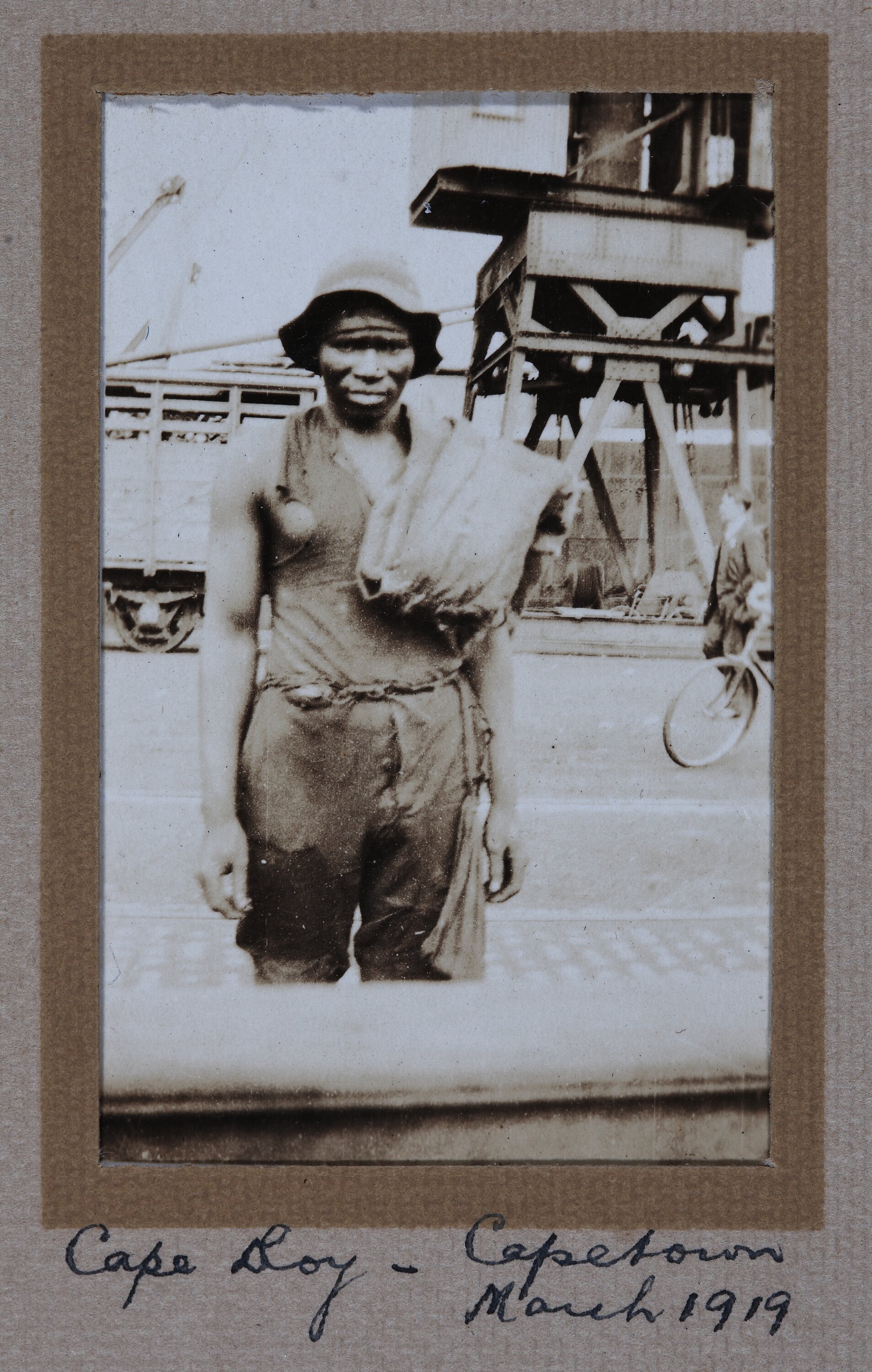 Hand-written in ink on the support underneath the photograph: 'Cape Boy - Capetown / March 1919'