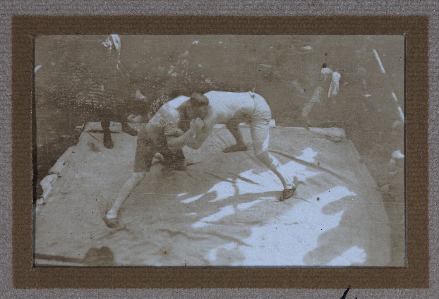 Two figures wrestling in what appears to be a makeshift ring. Other figures surround the ring, apparently watching the match, whilst a figure in what appears to be a uniform stands to the left and appears to be serving as umpire.