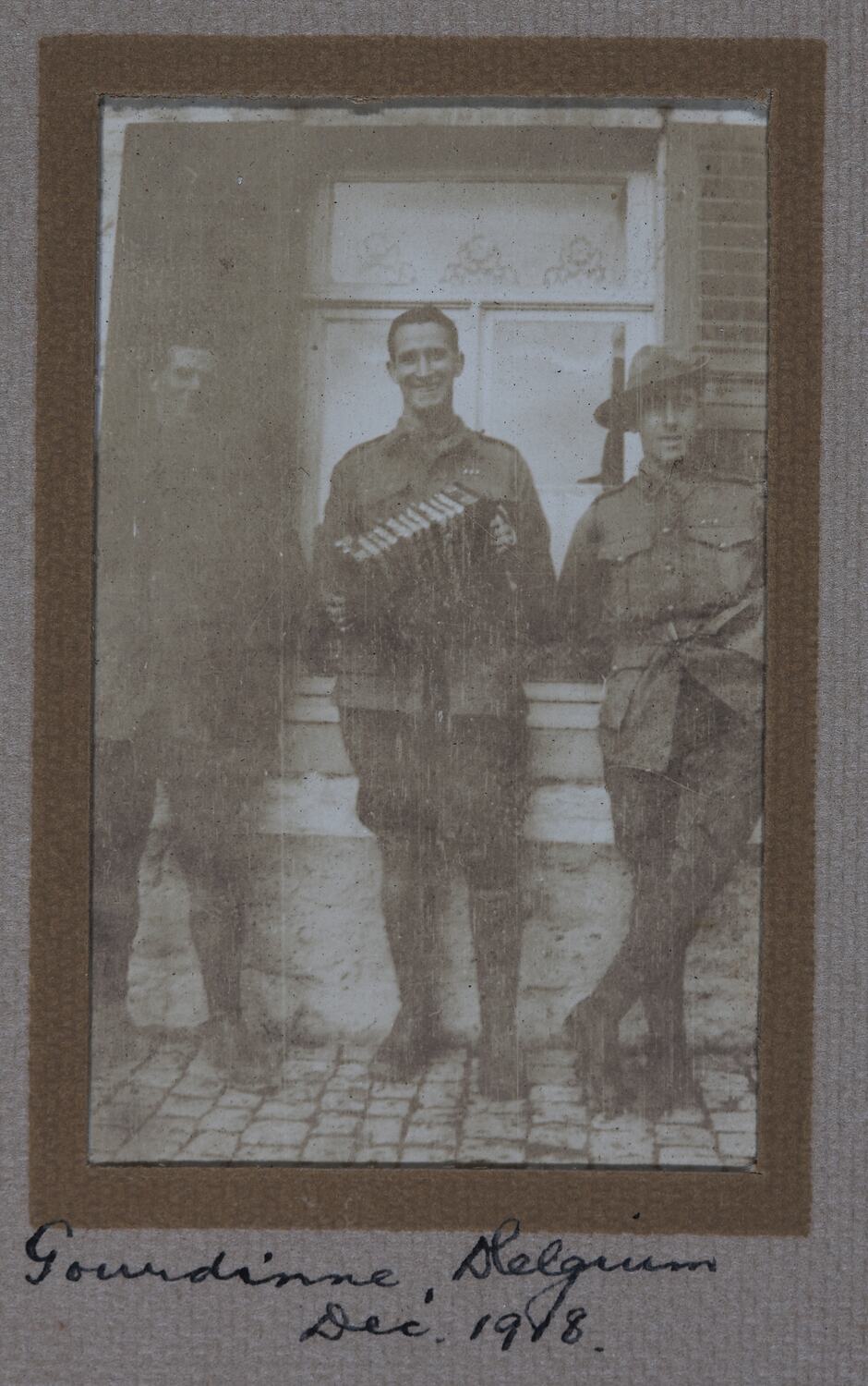 Image of three unknown servicemen at Gourdinne, Belgium. The serviceman in the middle of the group is playing an accordion. The image is dated to December 1918.