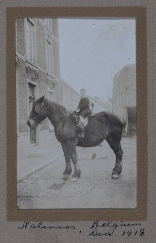 Image of a boy riding a horse in the streets of Nalinnes, Belgium. The image is dated to December 1918.
