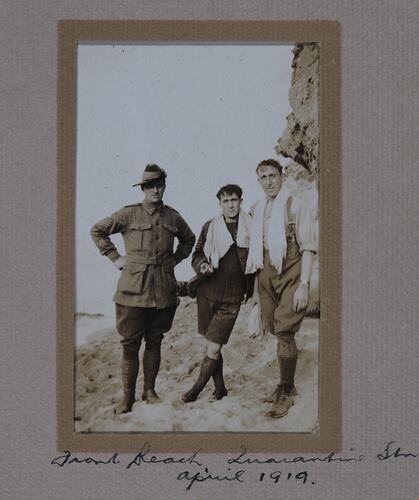 Image depicting three unknown servicemen, two of whom appear to have been for a swim. The inscription identifies the location as Front Beach in April 1919. It is therefore likely that this image was taken after Sergeant Major Mulcahy's return to Australia.