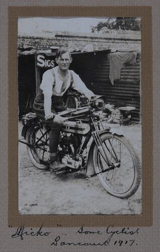 Hand-written in ink on the support underneath the photograph: '"Micko" - Some Cyclist / Bancourt 1917.'