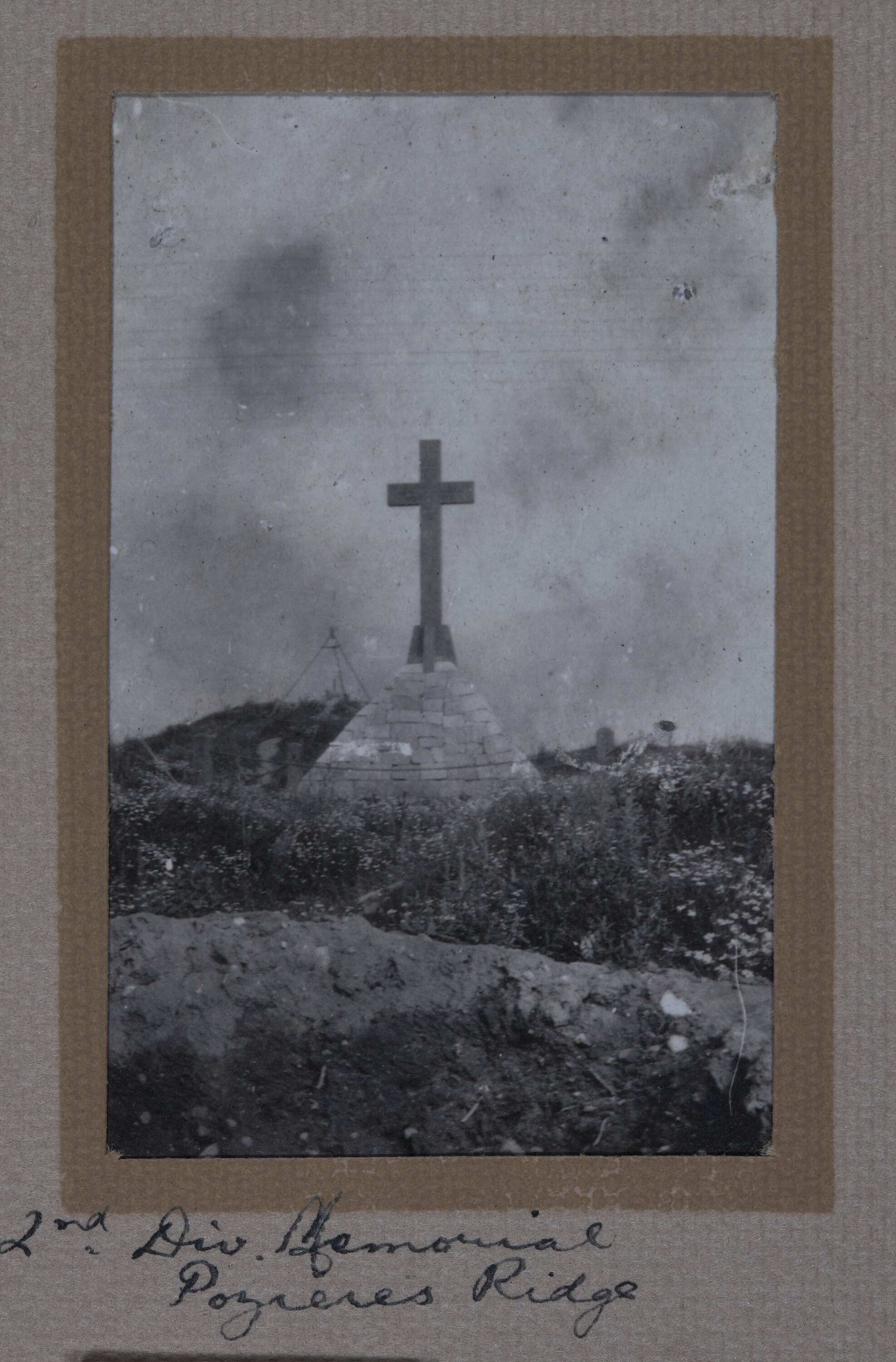 Hand-written in ink on the support underneath the photograph: '2nd Div. Memorial / Pozreres Ridge' Hand-written in ink on the back of the photograph: '2nd Div. / Memorial / (horizontal line) / Pozreres Ridge / (horizontal line) / Sept. 1917 / (horizontal line)'