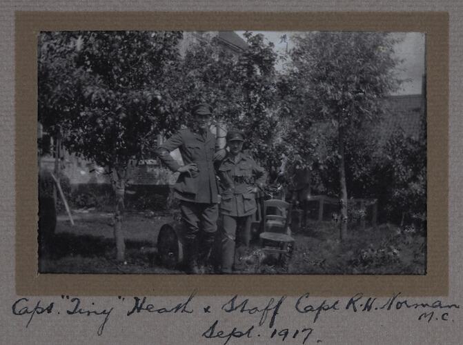 Hand-written in ink on the support underneath the photograph: 'Capt. "Tiny" Heath & Staff Capt R.H. Norman / Sept. 1917 : M.C.' Hand-written in ink on the back of the photograph: 'Capt Heath & Staff / R.H. Norman (obscured) / Sept'
