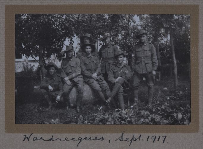 Hand-written in ink on the support underneath the photograph: 'Wardrecques, Sept. 1917.' Hand-written in ink on the back of the photograph: '(underlined) Standing: F. Bury, L.M. Mc(illeg.) / (left to right) Tim Richardson / (underlined) Seated: L. Cudden, E. Steel (obscured) / L. Neagee & self / Sept.'