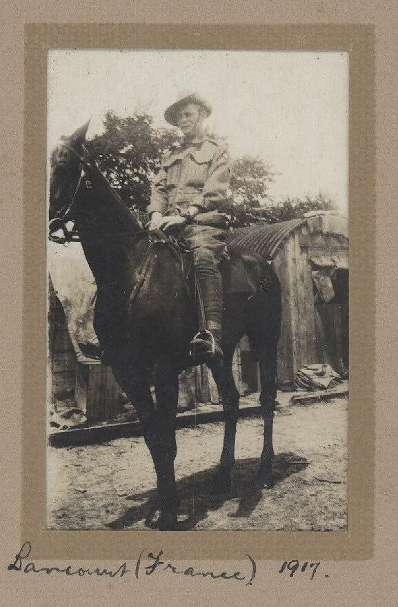 This photograph shows an unidentified man on a horse in Lancourt, France. His name and rank are not recorded. The image is dated to 1917.