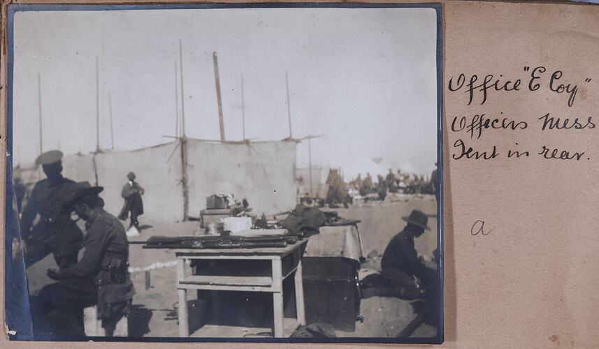 Image depicting the 'office' of the 7th Battalion E. Corp at Mena Camp, Egypt. The E. Corp. would later travel to Gallipoli a be a part of the second wave of the landing. Mena Camp was one of three training camps in Egypt that were used by the A.I.F. and the N.Z.E.F.