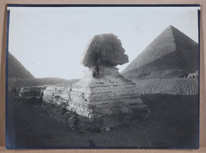 Hand-written in pencil on the back of the photograph: 'Sphinx / Pyramid in distance'