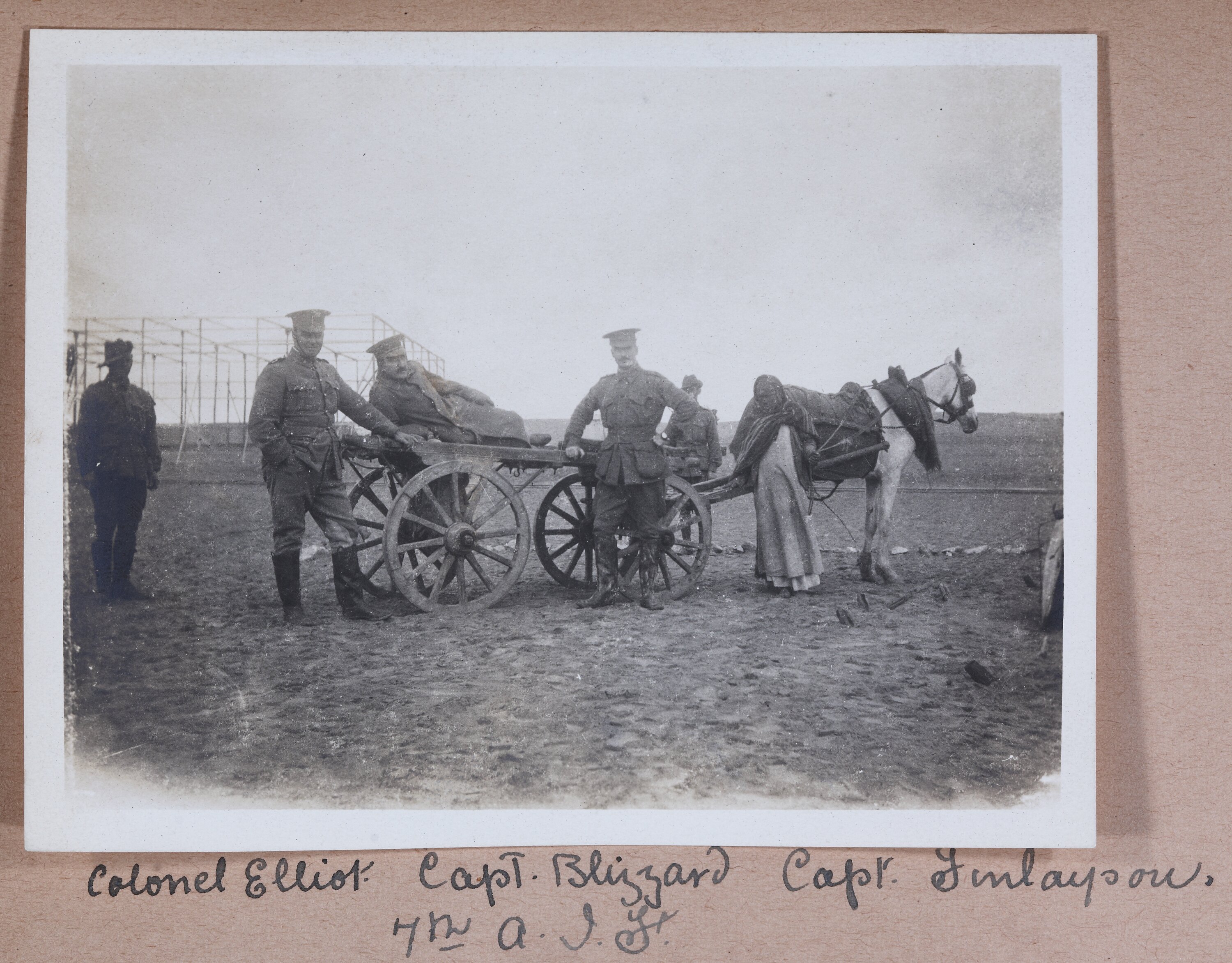 Hand-written in ink on the support underneath the photograph: 'Colonel Elliot Capt. Blizzard Capt Finlayson. / 7th A.I.F.' Hand-written in pencil on the back of the photograph: 'Col Elliot capt Blizzard on way for / Capt Finayson / (vertical line drawn on photograph)'