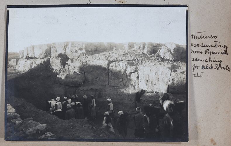 Hand written in ink on the support on the right hand side of the photograph: 'natives / excavating / near Pyramids / searching / for old Tombs / etc' Hand written in pencil on the back of the photograph: ' natives excavating near pyramids / searching for old Tombs etc' Ink stamped on the back of the photograph: 'PASSED' Ink stamped on the back of the photograph: 'CENSORS OFFICE / G.P.O / MELBOURNE' Hand-written in red ink on the back of the photograph: '(illegible)'