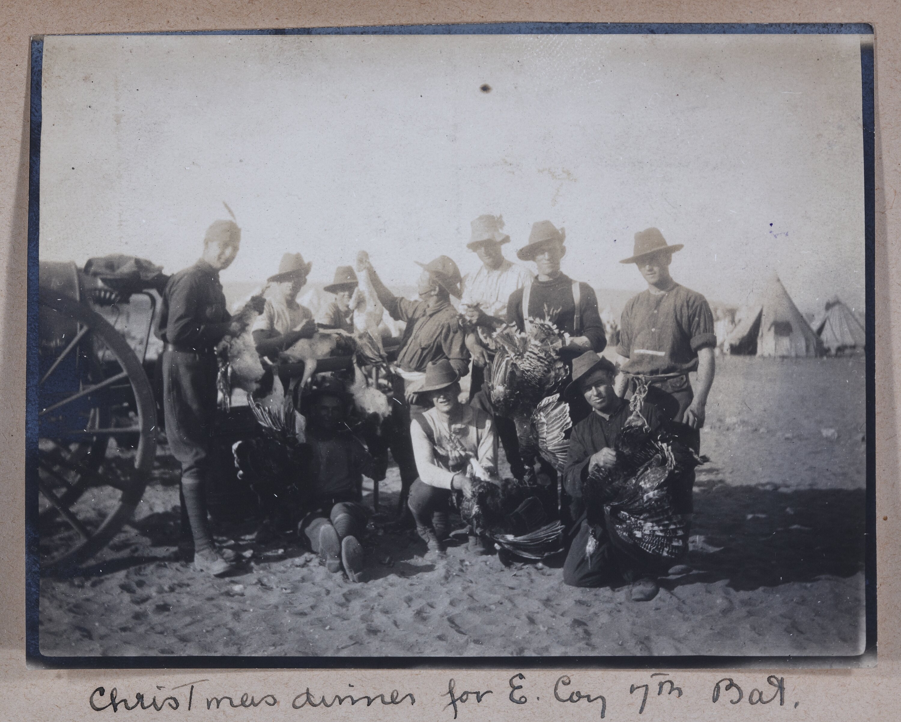 Hand-written in ink on the support underneath the photograph: 'Christmas dinner for E. Corp 7th Bat.' Hand-written in pencil on the back of the back of the photograph: 'Christmas Dinner / for E Corp 7th A.I.F / capt McKenna' Ink stamp on the back of the photograph: 'PASSED' Different ink stamp on the back of the photograph: 'CENSORS OFFICE / G.P.O. / MELBOURNE.' Hand-written in red ink on the back of the photograph: '(illegible)'