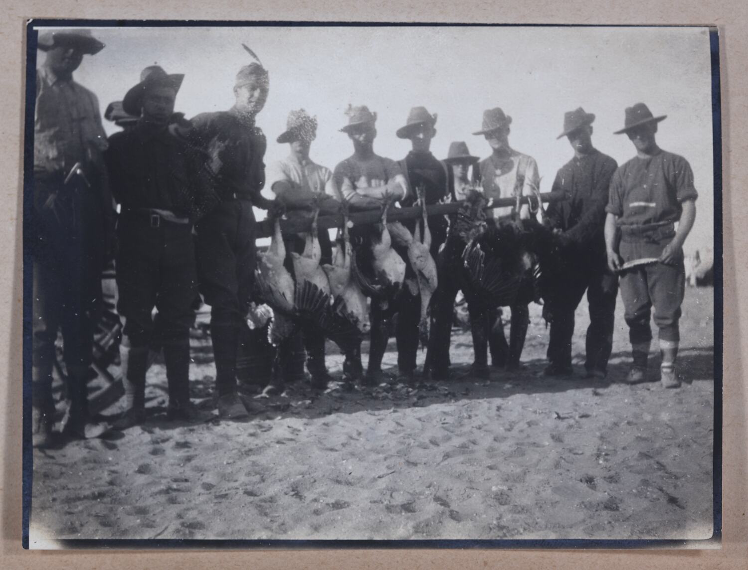 Across the photograph, facing the camera is a line of men, all standing. All of the men are in hats except for one, standing third from the left, who has what appears to be a headband with a feather sticking out of it. The majority of the men stand between the shafts of a cart. Hanging by their feet from the shaft in front of the men is a collection of half a dozen birds, apparently dead.
