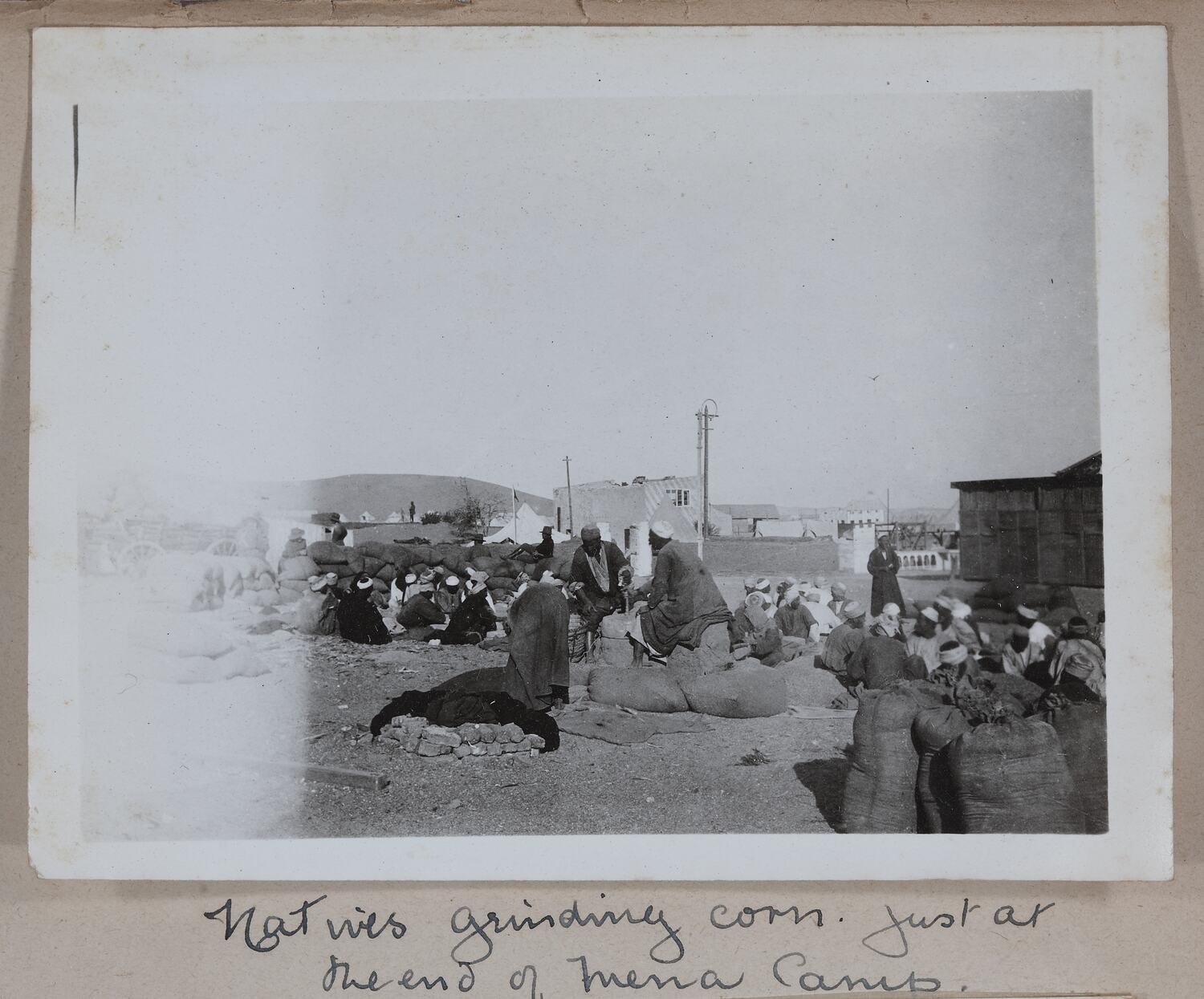 Image depicting a group of Egyptians grinding corn at Mena Camp. Mena Camp was one of three training camps in Egypt used by the A.I.F. and the N.Z.E.F.