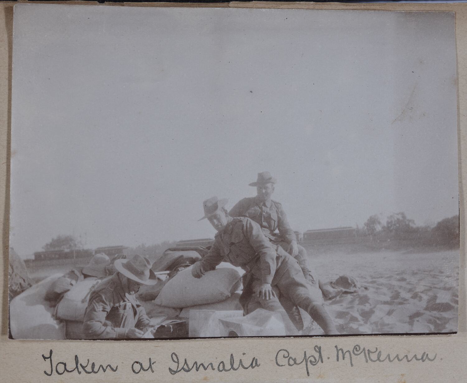 This image shows Captain McKenna and two other men in Ismalia. According the war diaries of the 7th Battalion the battlion moved to Ismalia following instructions received on the 2nd of February 1915.